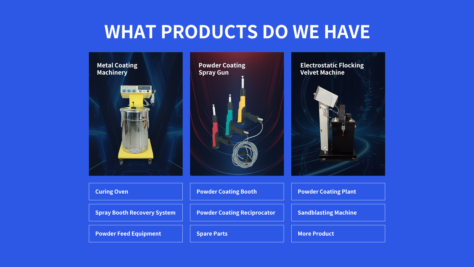 Powder Coating Machines For Sale include systems designed for applying and curing dry powder coatings. Key components are spray guns, powder hoppers, electrostatic generators, curing ovens, and conveyor belts.
